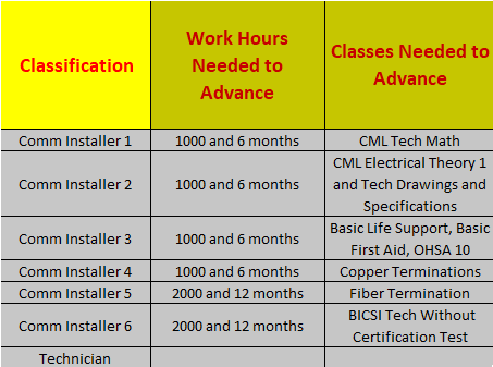Comm Installers will register for classes using their TradeSchool account. Some classes are done on your own through the online PTSI system. If the class title starts with CML this is an online class. Other classes will meet in a classroom on a scheduled night. The matrix below identifies the classes required to advance for each classification. Each class will come with a fee.